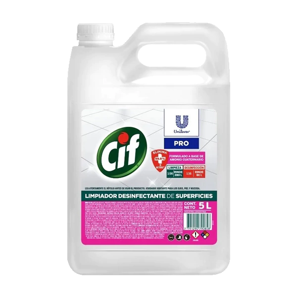 Cif Desinfectante Cuaternario X 5Lts:* LIMPIA, DESINFECTA Y DESODORIZA en un solo paso.* POTENTE BACTERICIDA.* PRODUCTO NO CORROSIVO.* EFECTIVIDAD en suciedad rebelde y con empleode aguas duras.* ATACA a los agentes causantes de olores resolviendoel problema desde el origen.