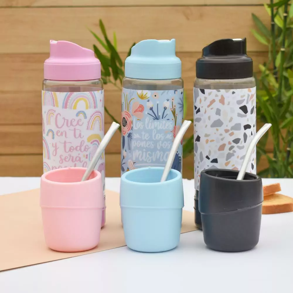 • Contenedor plástico de yerba, con tapa a rosca y filtro plástico en la base para tamizar el polvo de la yerba. Forrado con vinilo laminado brilloso.