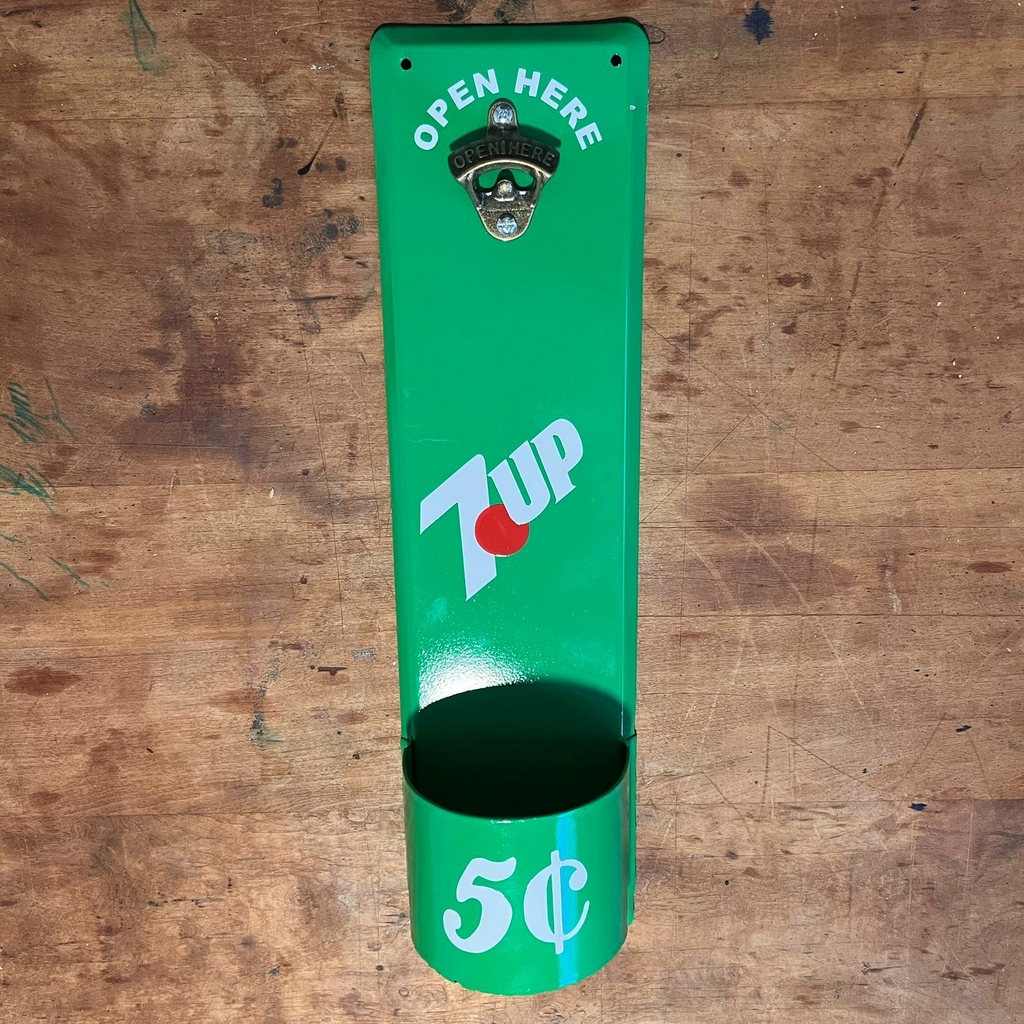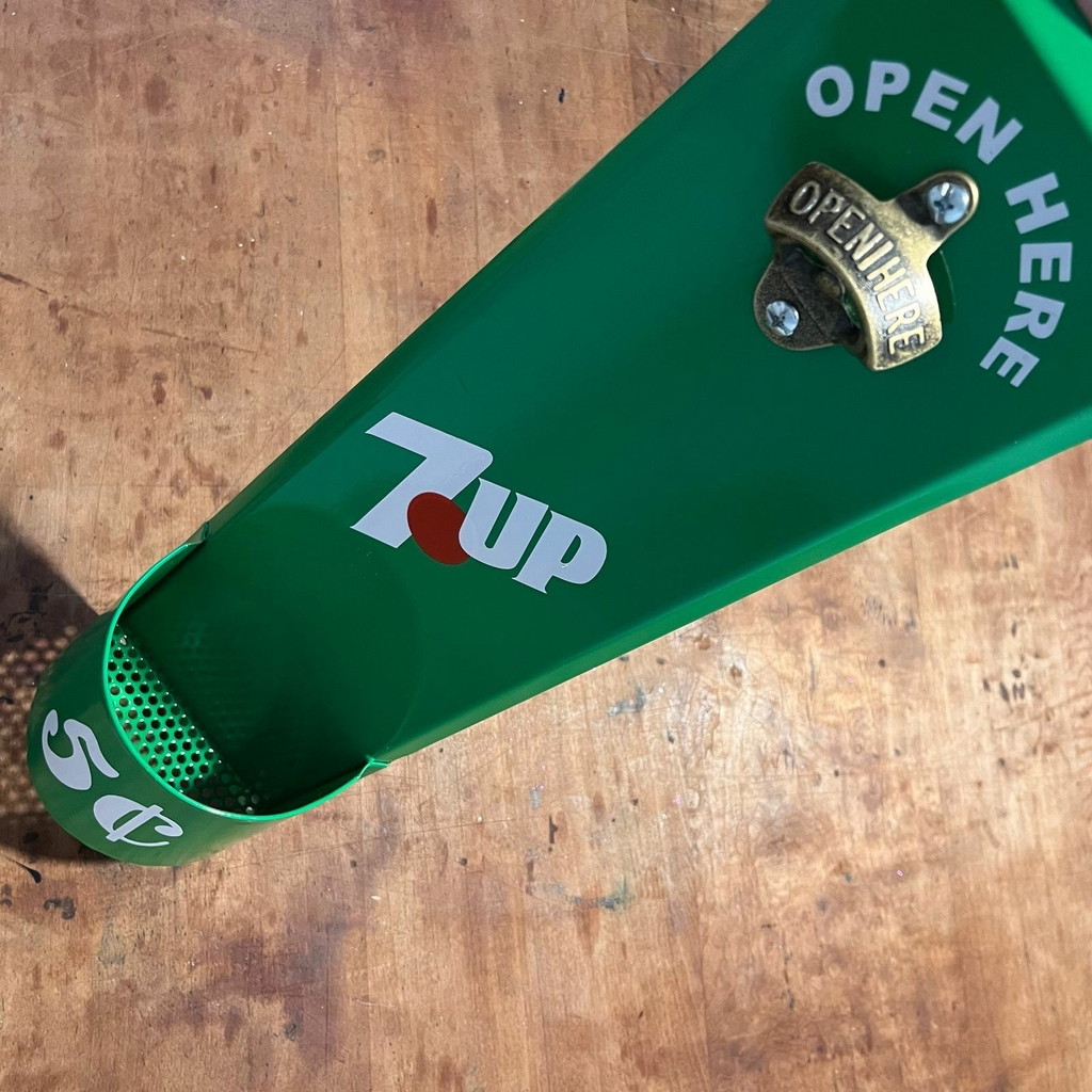 Destapador de metal fundido, sobre chapa gruesa con pintura automotriz y grafica en vinilo laqueada, con canasta contenedora de chapitas,