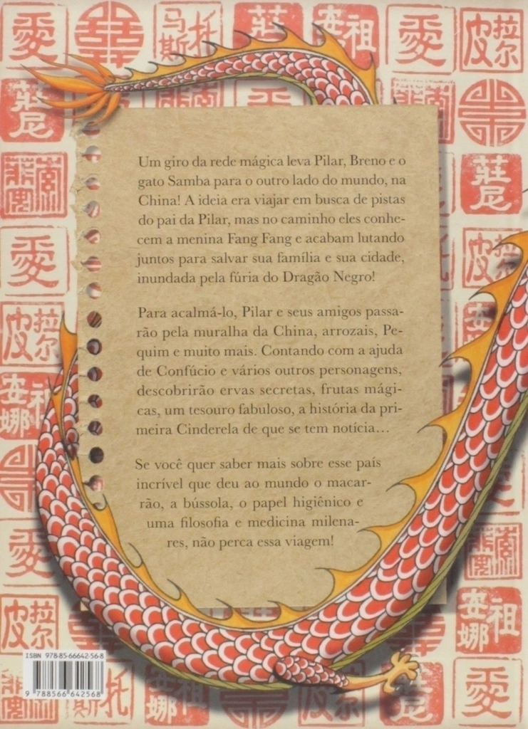 Pilar es una nena curiosa, inquieta y valiente, que siempre está en busca de nuevas aventuras. Junto a su mejor amigo Brena y su gato Samba, Pilar viaje en hamaca mágica a lugares exóticos y extraños.¡Un giro de la hamaca mágica lleva a Pilar, Breno y al gato Samba a China! La idea era buscar rastros del padre de Pilar, pero en el viaje conocen a una chica llamada Fang Fang y acaban luchando junto a ella para salvar a su familia y a su ciudad de la furia del Dragón Negro.En esta gran aventura, Pilar y sus amigos conocerán la Muralla China, arrozales, Pekín y mucho más. Con la ayuda de Confucio y otros personajes, descubrirán hierbas secretas, frutas mágicas, un tesoro fabuloso, la historia de la primera Cenicienta de la que se tiene noticia…Un viaje increíble para aprender más sobre el país que dio al mundo los fideos, la brújula, el papel higiénico y la porcelana, y cuya filosofía y medicina milenarias se practican aún hoy.Tapa blanda. 14cm x 19 cm.168 páginas. Letra minúsculaAutor: Flavia Lins e Silva. Ilustraciones Joana Penna