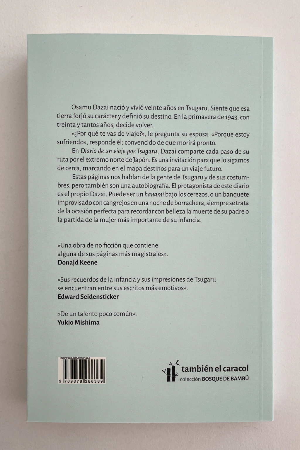 Diario de un viaje por Tsugaru.Osamu DazaiEditorial: TAMBIÉN EL CARACOL(DIARIO)Osamu Dazai nació y vivió veinte años en Tsugaru. Siente que esa tierra forjó su carácter y definió su destino. En la primavera de 1943, con treinta y tantos años, decide volver.«¿Por qué te vas de viaje?», le pregunta su esposa. «Porque estoy sufriendo», responde él, convencido de que morirá pronto.En Diario de un viaje por Tsugaru, Dazai comparte cada paso de su ruta por el extremo norte de Japón. Es una invitación para que lo sigamos de cerca, marcando en el mapa destinos para un viaje futuro.Estas páginas nos hablan de la gente de Tsugaru y de sus costumbres, pero también son una autobiografía. El protagonista de este diario es el propio Dazai. Puede ser un hanami bajo los cerezos, o un banquete improvisado con cangrejos en una noche de borrachera, siempre se trata de la ocasión perfecta para recordar con belleza la muerte de su padre o la partida de la mujer más importante de su infancia.Este libro pertenece a una selección literaria realizada por Lo de Cra.