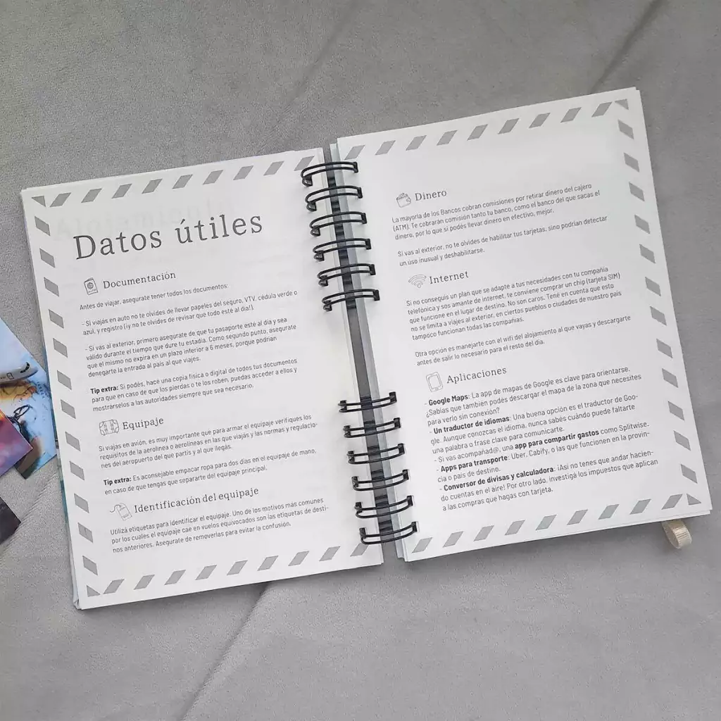 ¡200 páginas para vivir tu viaje antes y después de estar ahí!Personalizable con destino y nombre.Tiempo de producción: 8 días hábiles.⚠️⚠️⚠️⚠️¿CÓMO SE PERSONALIZA?Al avanzar con el proceso de compra vas a tener un espacio para NOTAS. En ese lugar dejanos el destino y nombre que quieras ponerle en la tapa.⚠️⚠️⚠️⚠️Tapas duras de cartón rígido forrado en tela estampada, con terminaciones de cinta y cierre con elástico al tono. Anillado metálico. Papel bookcel de alta calidad.Con lugar para todo esto:👉 Datos personales y del destino elegido.👉 Investigación previa: lugares a visitar, transporte, hospedaje, gastos estimados.👉 Itinerario de viaje: 3 planners mensuales para planificar (¡te sirve para un viaje de hasta 3 meses!).👉 Hoja de ruta y alojamientos: traslados a realizar durante el viaje y dónde vas a hospedarte.👉 Datos útiles para tu viaje.👉 Espacio para tomar notas sobre el idioma o modismos del lugar.👉 Checklist para armar la valija.👉 Tarjetas de embarque, para que guardes la información de tus vuelos o tu recorrido.👉 Excursiones: Datos previos y resumen de lo que hiciste, lo que te gustó, etc.👉 Playlist de tu viaje: los temas que marcaron esta aventura.👉 Gastos diarios y regalos: cuánto gastaste día a día y en eso que no podías dejar de traerte a casa.👉 Y como no podía faltar… ¡Muchas hojas rayadas y lisas para que sumes lo que quieras! Con espacio para la fecha por si lo querés usar como diario.Al final tiene un sobre doble de cartulina donde podés poner papeles y otros recuerdos.Además viene con:Bolsa de friselina para llevarlo con vos en toda tu aventura.