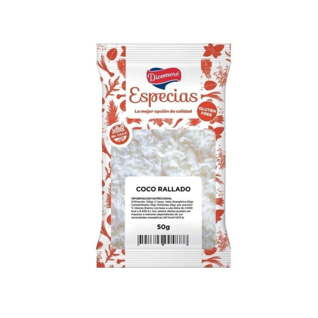 COCO RALLADORiquísimo coco rallado ideal para múltiples preparaciones tanto dulces de repostería como de cocina.Libre de gluten. Sin TACCPRESENTACIÓN:50G