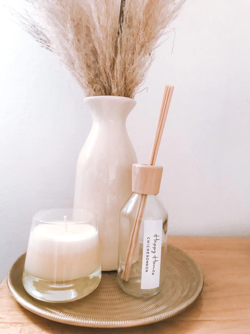 frasco de vidrio difusor con tapa de madera y palitos de bamboo. No incluye fragancia. Capacidad 250 cc.