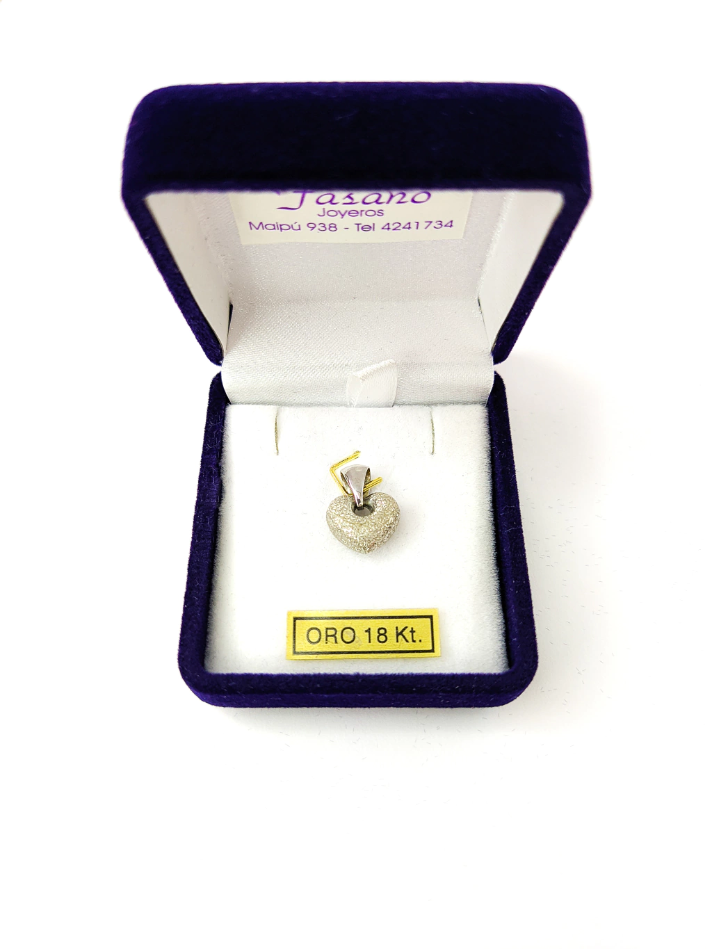 Les presentamos este hermoso dije de oro 18 kilates con forma de corazón. El mismo tiene un trabajo de arenado, que le da ese característico color blanco mate. La tonalidad del oro es blanco (explicadas las tonalidades del oro en Preguntas Frecuentes). En la cuarta foto pueden ver como queda presentado con una cadena. En ese caso se muestra con el Conjunto Hana, el cual está disponible también para la venta.