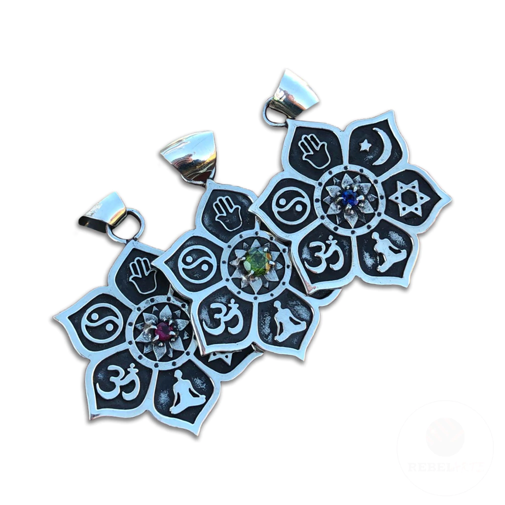 Gran dije flor con símbolos y gema central. Fabricado en metal macizo, garantía de por vida por el metal. Poseé gema central a elección, tanto Zirconias Cúbicas como piedras minerales naturales (Distinto valor dependiendo de la piedra natural).Medidas: 4cmDisponible en Alpaca y Bronce (Dorado). Plata 925 solo por pedido a cotizar.