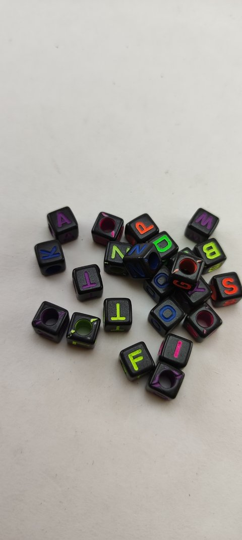 Dijes de letras pasantes 6x6 mm.Color negro con letras fluor.50 gramos.Aproximado 150 piezas.