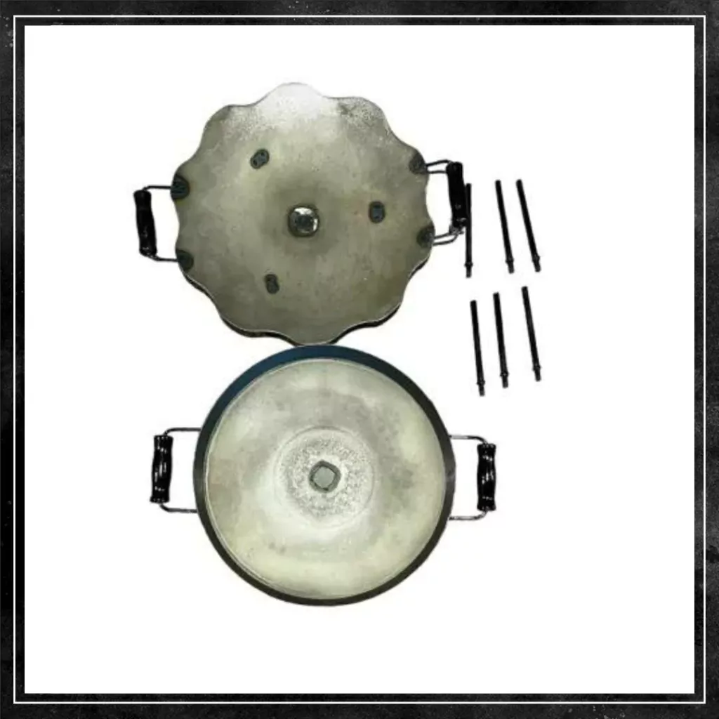 Disco de arado, tapa y patas desmontables. La tapa se transforma en plancha bifera al colocarle un juego de patas adicionales a rosca. Manijas laterales Peso aprox. 11kilos.