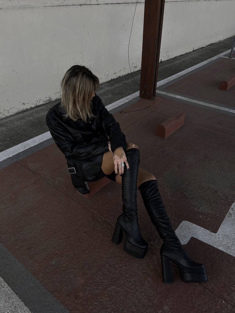 Botas con doble plataforma y caña elastizada. Se puede usar a la altura que más te guste :) Material: PU - sintético. Caña: 47cm. Taco 12cm y plataforma 6cm. APTO VEGANO