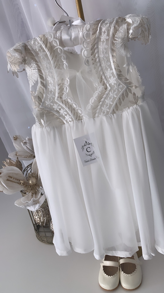 Descripción:Es un vestido muy delicado de alta costura en tonos neutros, con un tul bordado importado que tiene destellos en tonos oro y crudo. Su falda con mucha tela y caída tiene vuelo de princesa, la espalda bordada y mangas con terminación a mano. La forreria del vestido es en un género de algodón para cuidar la piel de las bebés y nenas. Puede ser manga corta bordada o también, manga larga bordada.Qué incluye:El precio incluye el vestido publicado, en caso de querer agregar un accesorio para el cabello podes consultarnos las opciones en stock.Talles en que se confecciona:Se confecciona desde 0m al T8 de niña.IMPORTANTE:Es una prenda de alta costura:no contamos con stock inmediato de todos los Vestidos Soñados en todos sus talles, por tal la demora en confeccionar es de aproximadamente 15 días desde la fecha de pago y coordinación de medidas. La web permite comprar el vestido, pero no muestra el stock real.Podes consultarnos a nuestro WhatsApp el stock de entrega inmediata, listos para enviar/retirar.Respecto al talle:selecciona el que más se aproxime a sus medidas y edad (encontras las medidas de los Vestidos Soñados en las tablas de abajo). Luego nosotros nos vamos a comunicar por privado para pedirte sus medidas; son muy simples de tomar a través de un instructivo que te brindamos. De esta forma vamos a poder asesorarte con el talle correcto (cada Soñado tiene atención personalizada).Si todavía falta bastante tiempo para tu evento (tres meses o más):confeccionamos y entregamos el vestido dentro de los siguientes dos meses de realizado el pago. Una vez que recibamos las medidas, vamos a poder asesorarte con un talleestimadopara el día del evento, pero queda a consideración del cliente definir el talle ya que no podemos saber con tanta anticipación cuál va a ser el talle correcto. A través de estos años diseñando, sabemos que con 2 mes de anticipación, el talle no varía (esto es igual para ballerinas y abrigos).Hay que tener en cuenta los tiempos de envío:esto dependerá de las empresas de correo y podes calcularlo con tu código postal, también podes retirar directamente por nuestro local o podemos enviar una motomensajeria a GBA y CABA (todas estas opciones las elegís en la compra).Tabla de medidas: