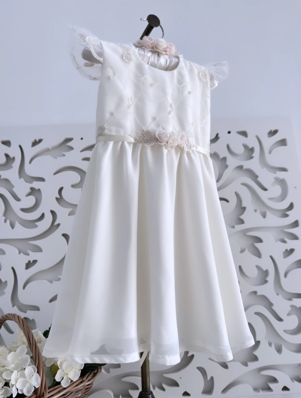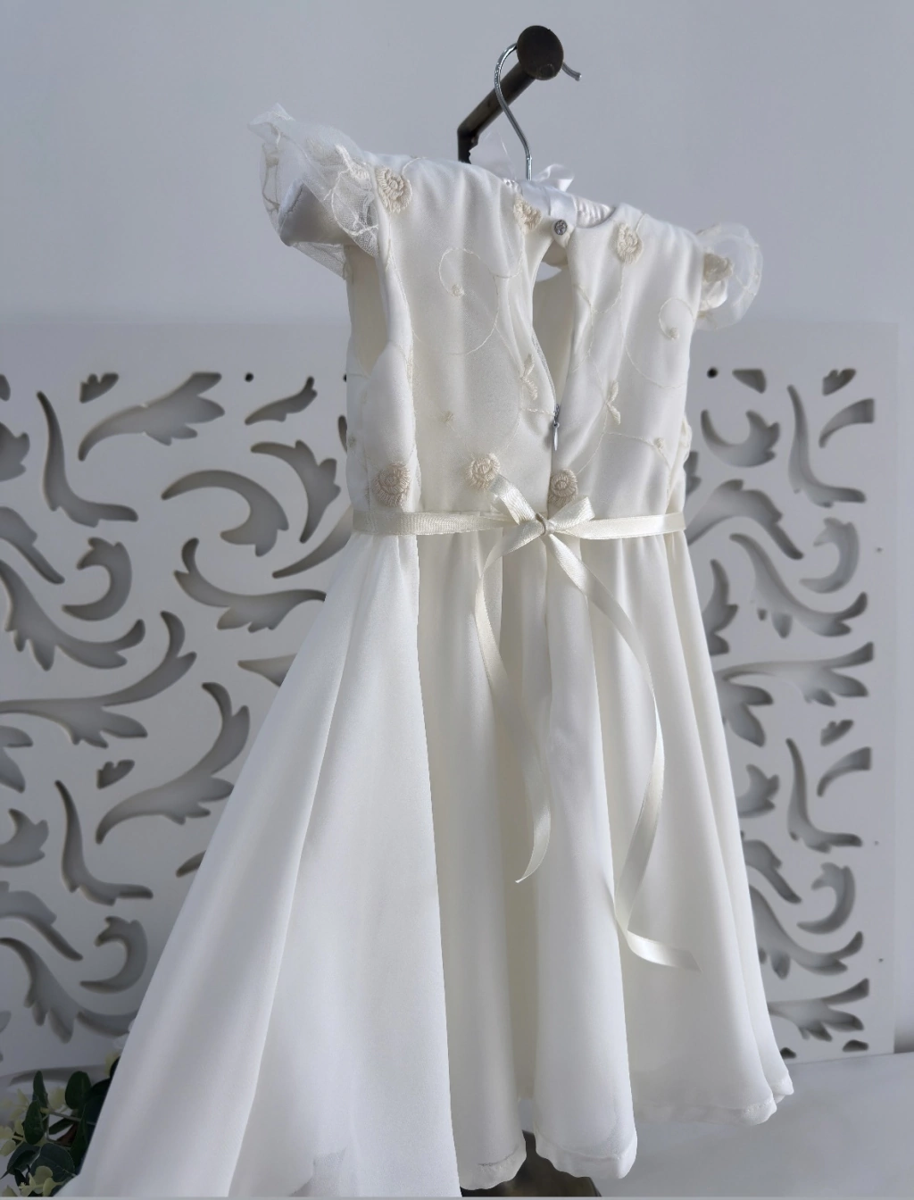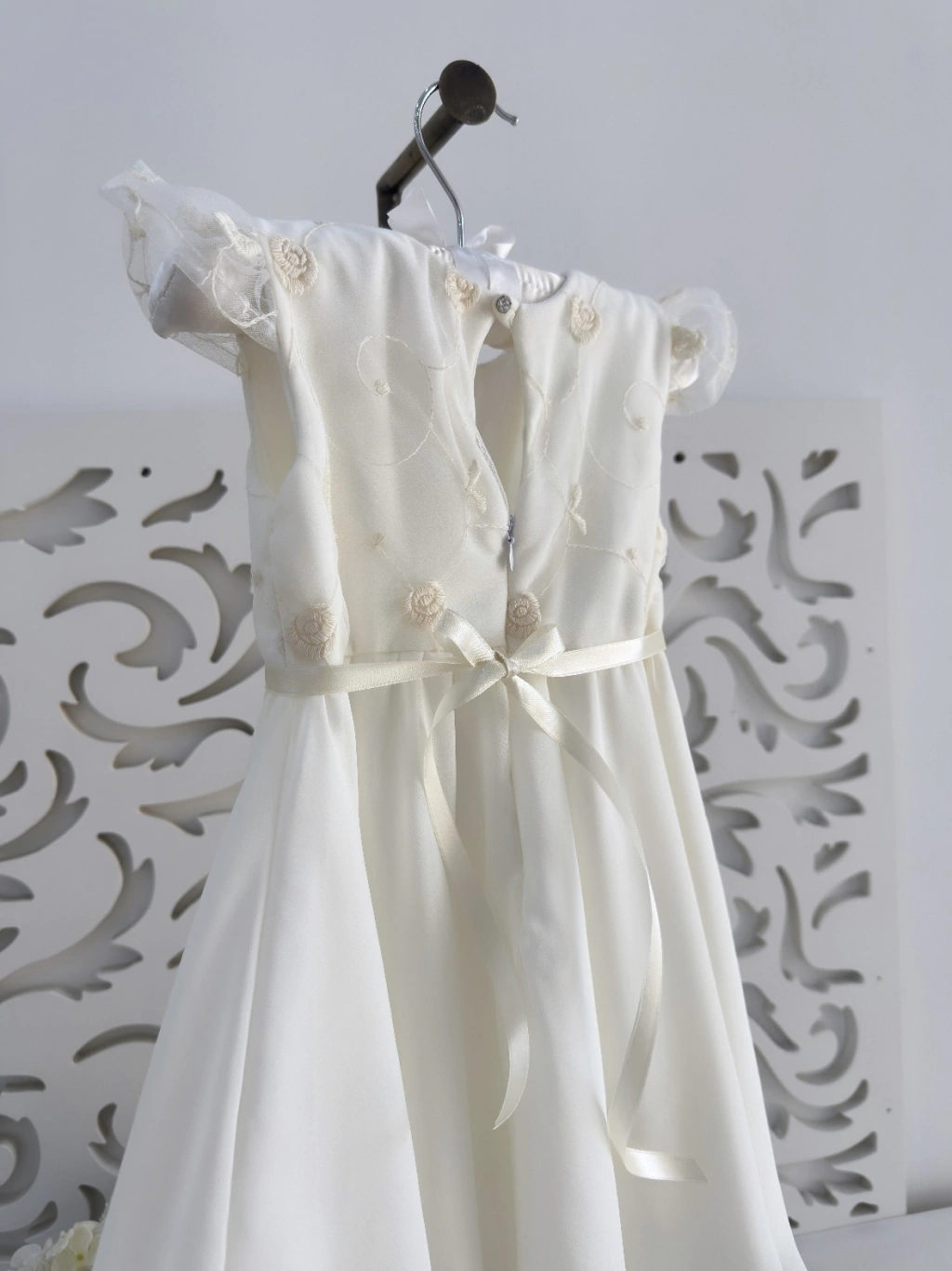 Diseño Le Vie con canesú y mangas de volado en tul de algodón bordado, su falda tiene vuelo~ Es un diseño de alta costura exclusivo de Cocó, con géneros importados. Incluye un lazo bordado en la cintura (consultar los modelos de bordados para la cintura en stock ya que puede variar). Su forreria es en cotton, es decir que es en algodón, esto hace al vestido fresco y delicado.