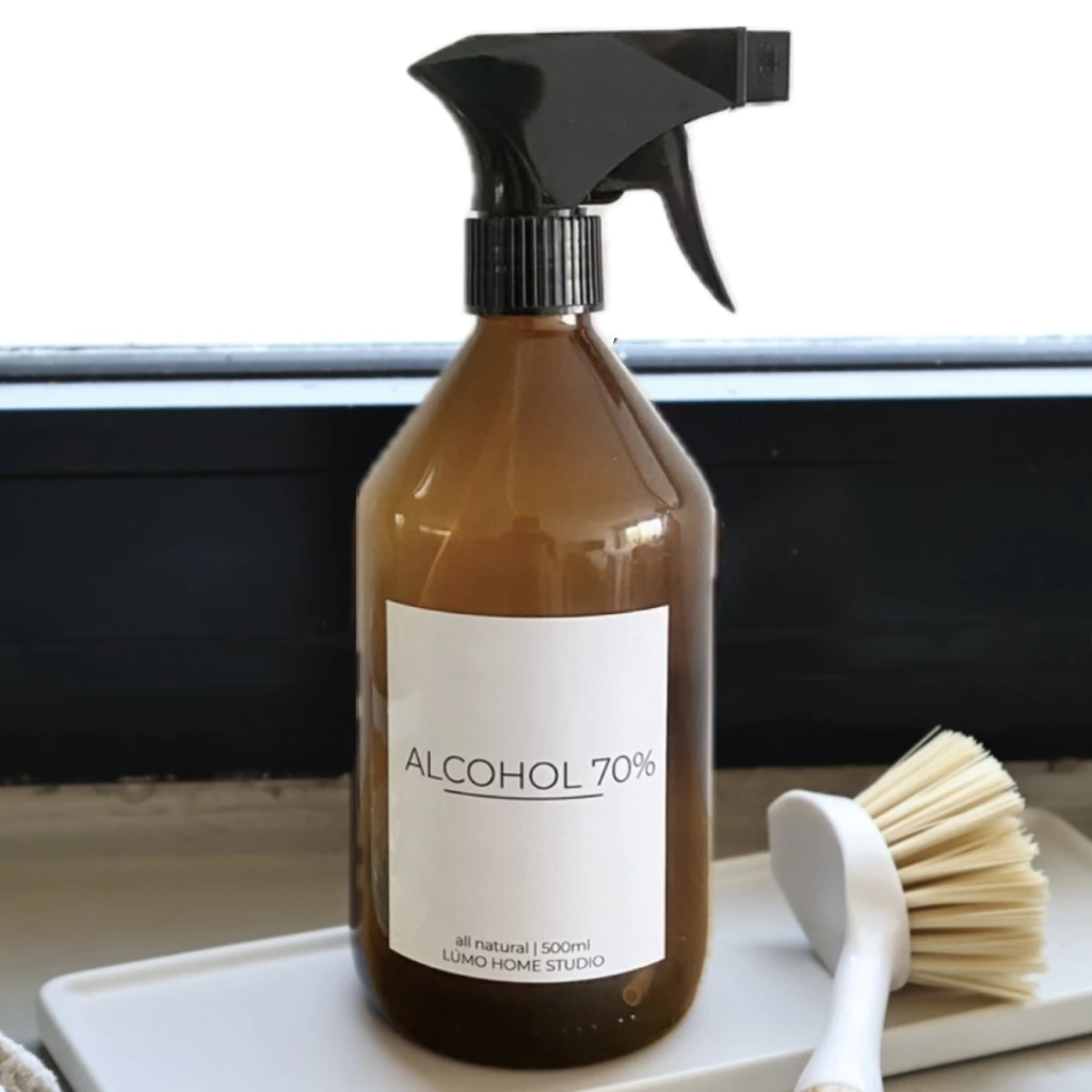 Dispenser de vidrio ámbar con válvula pulverizadora El envase es reutilizable, ecológico y sustentable. La etiqueta es resistente al agua "alcohol 70%"