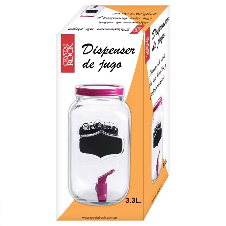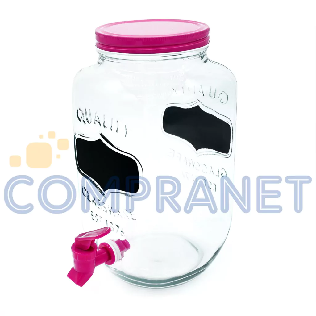 Dispenser de Bebida, Frasco de Vidrio con detalles en relieve, tapa a rosca y canilla de plástico de variados colores.De fácil traslado. Incluye dos espacios “Pizarra” para escribir con tiza y etiquetar contenido (en el frente y dorso).Capacidad: 3,3 Litros.Porque nos encanta lo práctico y funcional, te presentamos este moderno dispenser con tapa a rosca. Su cuerpo de vidrio soporta bajas temperatura sin romperse. Ahora podrás servir de mejor manera las bebidas en tus reuniones.Colores de la canilla y la tapa: Verde, Rosa y Naranja.Medidas del Dispenser: 27 cm (alto) x 13 cm (ancho) x 13 cm (prof.)Tapa: 11 cm (diámetro)