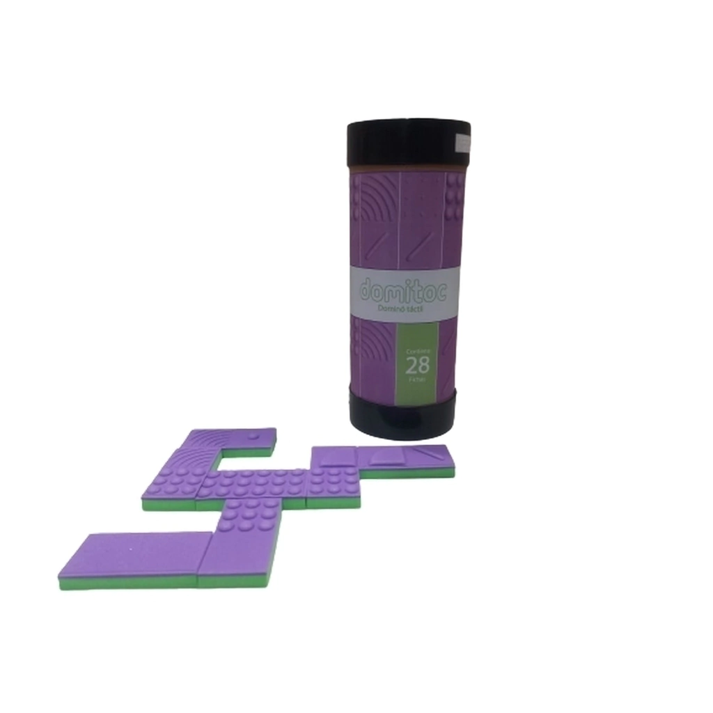 Domitoc es un dominó tactil compuesto por 28 piezas fabricadas en goma eva termoformada de 6x3 cm y 1,1 cm de altura ideal para personas ciegas y con discapacidad visual. Contiene 7 motivos distintos con formas y texturas en relieve.