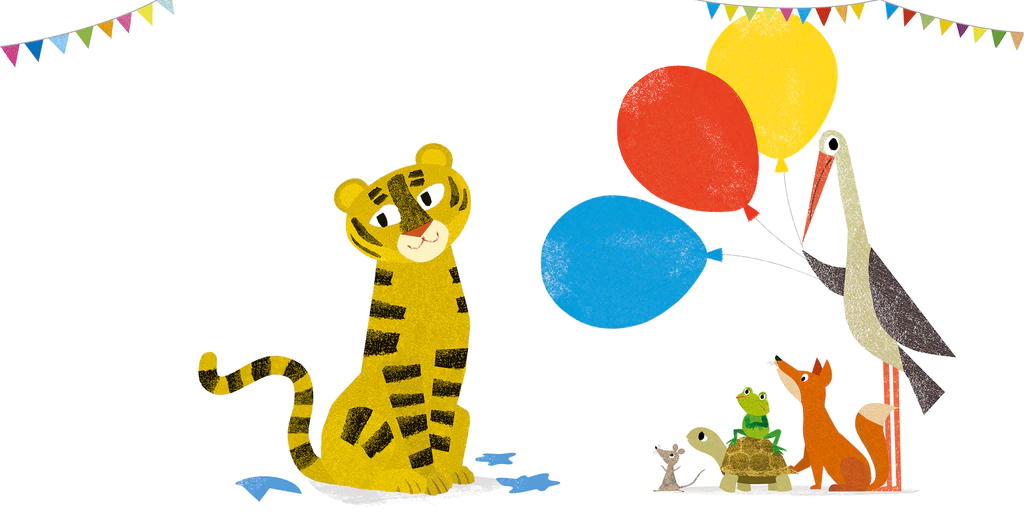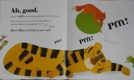 Duerme pero - ¡oh Dios! - ella está mintiendo completamente en el camino. ¿Cómo pasarán los animales sin despertarla? Afortunadamente, Frog tiene una idea excelente y, sosteniendo su globo, ¡flota sobre el Tigre dormido! Fox es el siguiente, seguido por Tortoise, Mouse y Stork, ¡pero será complicado para todos pasar sin que Tiger se dé cuenta! Es un buen trabajo que el lector esté ahí para ayudar a mantener a Tiger dormido, ¿no es así? Pero, ¿a dónde van exactamente con todos esos grandes globos brillantes? ¿Crees que podría ser el cumpleaños de alguien? ¿Puedes adivinar quién?