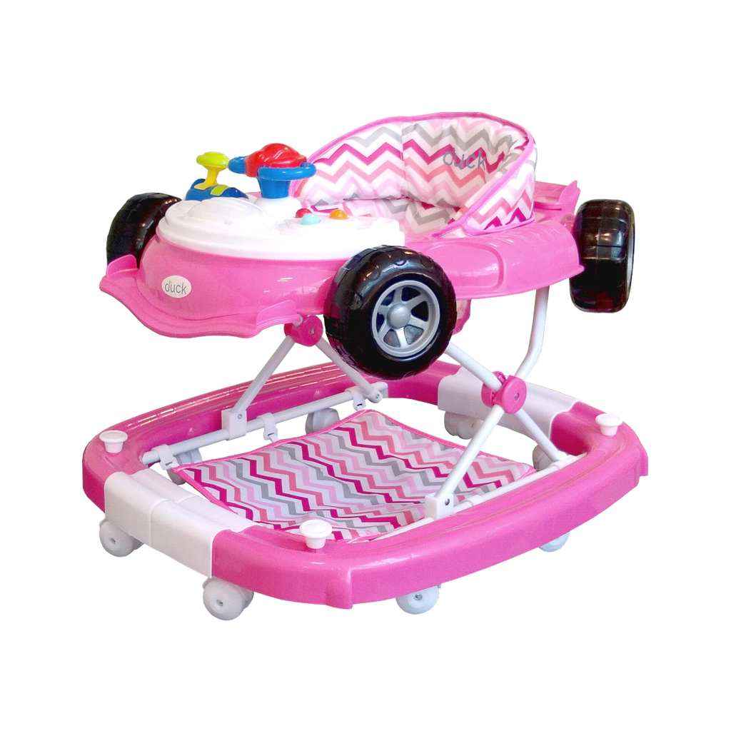 ____________________________________________DUCK ANDADOR MECEDOR FORMULA 1DESCRIPCIÓN:Bandeja de juegos removible con luz y sonido.Funciona con 2 pilas AA (no incluidas)Con Piso-Alfombra (evita el contacto directo con el piso)Asiento mullido y confortable.Ruedas anti-vuelco.Este andador esta pensado para niños pequeños que puedan estar sentados por sí solos a partir de los 6 meses y hasta los 15 Kg. máximo.Tiempo de uso recomendado, 20 minutos. Para evitar dependencia se recomienda no mas de ese tiempo de corrido.MODOS DE USO:Mecedor: Esta función permite mantener al bebe en una ubicación meciéndose sin riesgos a que avance, pero ejercitando sus piernas. (Separando el soporte de las ruedas e inclinándolas se utiliza como mecedor)Andador:Pensado para ayudar al desarrollo y estímulo en sus primeros pasos.Alturas:Alto total: 53 cm.El alto hasta la bandeja es de 45 cm.- 1º altura: 41 cm- 2º altura: 43 cm- 3º altura: 45 cmEl alto hasta el asiento es de 25 cm.- 1º altura: 21 cm- 2º altura: 23 cm- 3º altura: 25 cmColor:ROSA.