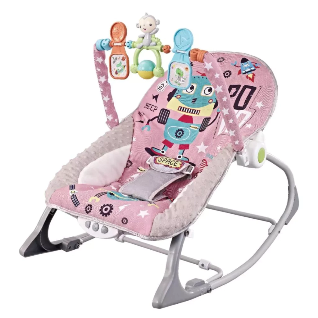 ____________________________________________MECEDORA CON VIBRACIÓN Y MÚSICA - 0-18 KG.DESCRIPCIÓN:La mecedora musical con juegos y vibración es una silla multifuncional que se transforma fácilmente de mecedora a silla fija.Movimientos vibratorios que brindan una sensación de suaves masajes.Barra de actividades con juguetes colgantes que estimulan los sentidos del bebé.La barra de juguetes se quita fácilmente para que los niños pequeños se sienten y jueguen.Asiento reclinable en 2 posiciones.Los movimientos naturales del bebé hacen que el asiento se balancee suavemente..Incluye funciones musicales y de vibración para entretener y calmar al bebé.Cinturón de seguridad de 3 puntos para proteger al niño.El asiento acolchado es removible y lavable para una limpieza conveniente.Soporta hasta los 18 kg. aproximadamente.Requiere: Pilas 3 x AA/1.5V. No incluidas.Color: Robot Rosa.