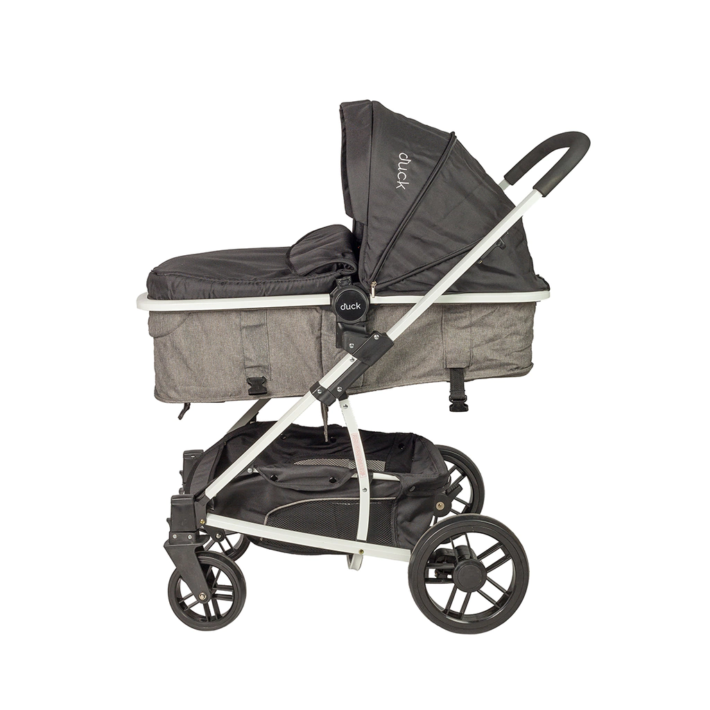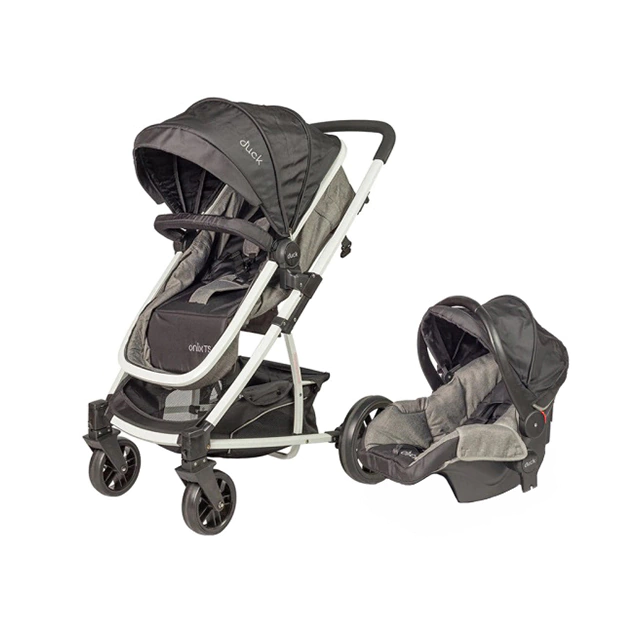 Duck travel system 3 en 1 OnixEstructura de aluminio.Plegado con o sin el asiento.Coche intercambiable, se puede utilizar con el asiento o con el huevito sobre el chasis directamente.Moisés convertible a asiento.Capota estilo europeo con parasol extensible.El carrier NO incluye base para auto.Incluye cubrepiés para el asiento / moisés.MOISÉS Y ASIENTO ADAPTABLEEl asiento puede convertirse en moisés con solo 3 pasos lo que permite llevar a tu bebé completamente recostado.  Además incluye un huevito / carrier diseñado para su uso en el automóvil. Asiento o huevito pueden colocarse en el cochecito de frente de manera que puedas verlo en todo momento.SEGURIDAD Y COMODIDADEl cochecito posee apoyapiés regulable en altura y respaldo con múltiples posiciones, incluído el reclinado total lo que lo hace apto para recién nacidos. Además, la barra frontal desmontable y el cinturón de seguridad con cinco puntos de anclaje, brindan una gran protección al bebé mientras esta dentro del rodado.HUEVITO Y MOISÉS EXTRAÍBLESEl modelo 3 en 1 incluye huevito y moisés extraíbles. Estos últimos se colocan en el cochecito de frente de manera de ver al bebé en todo momento. La capota del moisés cuenta con cuatro posiciones y permite llevar al recién resguardado del sol y del viento. Por su parte, el huevito también está diseñado y homologado para su uso en automóvil.ESTRUCTURA REFORZADALa estructura reforzada hace que el cochecito sea resistente y duraredo, permitiéndole soportar un peso hasta 15 kg. ( de 3 a 4 años aproximadamente ).RUEDAS CON AMORTIGÜACIÓNEl cochecito posee cuatro ruedas con amortiguación que lo hacen estable para la rutina diaria. Las ruedas traseras poseen frenos sincronizados, mientras que las delanteras son giratorias e incluyen trabas para mantenerlas sobre el eje, lo que facilita el desplazamiento en terrenos irregulares.SISTEMA DE PLEGADO COMPACTOEl cochecito cuenta con un sistema de cierre que lo hace compacto y fácil de guardar y trasladar.MATERIAL: Estructura de aluminio.PESO DEL CHASIS: 5 kgs.PESO SOPORTADO: Recomendado desde recién nacido hasta 15 kg.MEDIDAS ABIERTO: 100cm de alto x 97cm de profundidad x 64cm de ancho.MEDIDAS CERRADO CON MOISÉS: 110cm de alto x 47cm de profundidad x 64cm de ancho.MEDIDAS CERRADO SIN MOISÉS: 85 cm de alto x 26cm de profundidad x 64cm de ancho.
