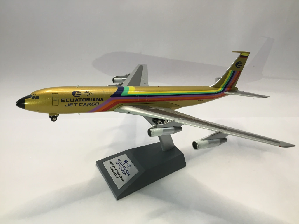Avion: Boeing 707-321Compañía: Ecuatoriana Jet CargoMatricula: HC-BGPMarca: El Aviador ModelsMaterial: Metal (Diecast)Escala: 1:200Largo de Fuselaje: 23 cm.Envergadura de Alas: 22 cm.Producto Exclusivo