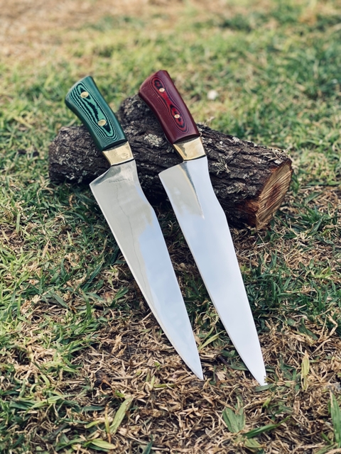 ¡Modelo Macho! Medidas: - largo de hoja: 26cm - largo total: 38 cm Cabo: micarta verde o rojo. Hoja inoxidable 420.- Detalle en bronce.