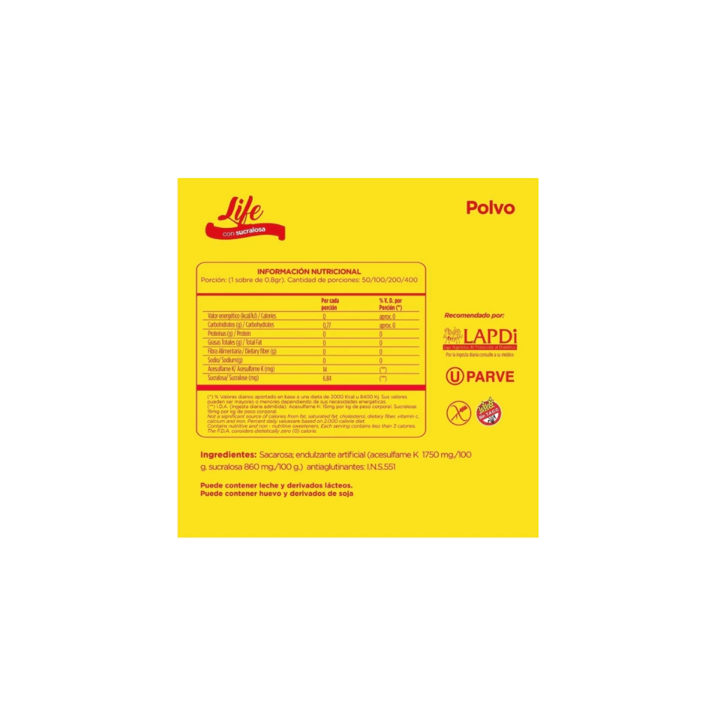 El Edulcorante Dulkré Life con Sucralosa es la forma más práctica y saludable de endulzar tus comidas y bebidas. Gracias a su fórmula a base de sucralosa, ofrece el sabor del azúcar pero sin calorías, ideal para quienes buscan cuidar su alimentación sin resignar sabor. Cada sobre equivale a 2 cucharaditas de azúcar, endulzando aproximadamente 100cc de bebida. Es apto para cocinar, perfecto tanto en preparaciones dulces como en bebidas frías (jugos, licuados) o calientes (café, té, mate). Libre de gluten y de aspartamo, es seguro para personas con celiaquía o diabetes. Presentación en caja con 400 sobres de 0,8g, garantizando practicidad e higiene.