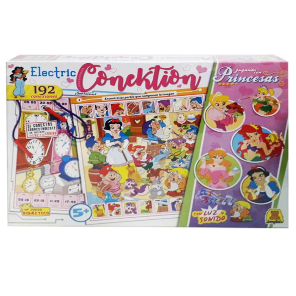 ELECTRIC CONEKTION JUGANDO CON PRINCESAS375IMPLASLa línea de conectores educativos Electric Conektion esta ideada para que los niños aprendan mientras se divierten. Ya sea jugando de forma individual o en grupo. Electric Conektion introduce a los niños en el mundo de la asociación, el desarrollo visual y motriz y la comprensión lingüística.Este juego incluye 12 láminas que invitan al conocimiento y la diversión.Jugando con las más lindas princesas,los niños podrán desarrollar habilidades motrices y cognoscitivas.Estimular la memoria visual,introducirse en la lectura y realizar operaciones matemáticas simples.La actividad ideal para iniciar y complementar la educación.Cada lámina indica cual es la lógica de la conexión.Es recomendable la guía de un adulto para acompañar el juego .Compartir con los niños es sano y divertido.La actividad ideal para iniciar y completar la educación.Funciona con dos pilas LR44 (INCLUIDAS)Para comenzar a jugar, sacar todas las láminas de la caja. Colocar de a una lámina por vez, asegurándose que este en la posición correcta (ver imagen de tapa).Tomar los cabezales conectores y apoyar uno de ellos sobre el punto correspondiente a una pregunta (superior o inferior) y el otro en la respuesta (dentro de la lámina).Incluye una guía de ayuda con las respuestas..