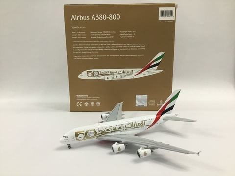 Avion: AIRBUS A380-800Operador: EMIRATESMatricula: A6-EVGLivery: United Arab Emirates 50Marca: Gemini JetsMaterial: Metal (Diecast)Escala: 1:400Largo de Fuselaje: 17.5 cm.Envergadura de Alas: 20 cm.Producto Exclusivo