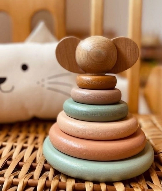 Encastre de madera, compuesto por 6 anillos torneados pieza por pieza artesanalmente.Con bochita con orejas en paraiso para finalizar .Pintado a mano con pintura al agua no tóxica.