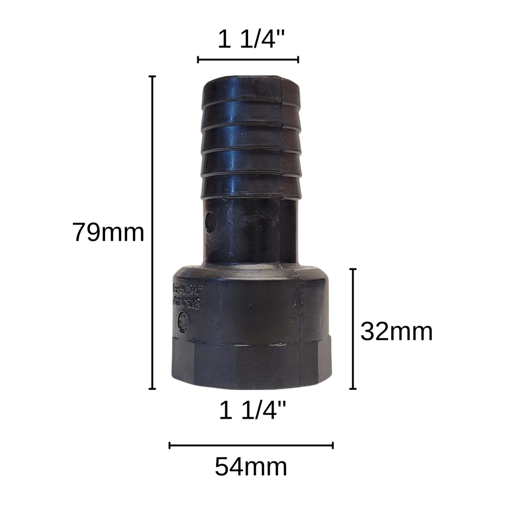 - Un extremo enchufe macho 1 1/4", otro extremo rosca hembra de 1 1/4".