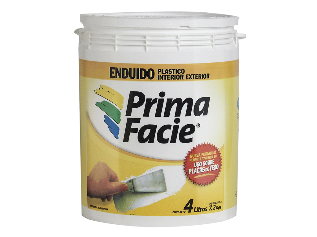 Prima Facie Enduido Plastico al Agua está fabricado en base a polímeros acrílicos. Puede ser utilizado indistintamente en interiores o exteriores, tanto en mamposterías como sobre paneles de yeso o maderas (no apto para aplicarlo sobre metales o plásticos). Es usado para rellenar o emparejar superficies deterioradas. En paredes con yeso para reacondicionar las mismas. También sobre revoque fino como relleno o texturado decorativo. Una ajustada consistencia cremosa del producto permite aplicarlo en capas sucesivas sin desprendimiento de las anteriores, brindando un significativo ahorro de tiempo. Ya seco, un mínimo y suave lijado completa el trabajo.