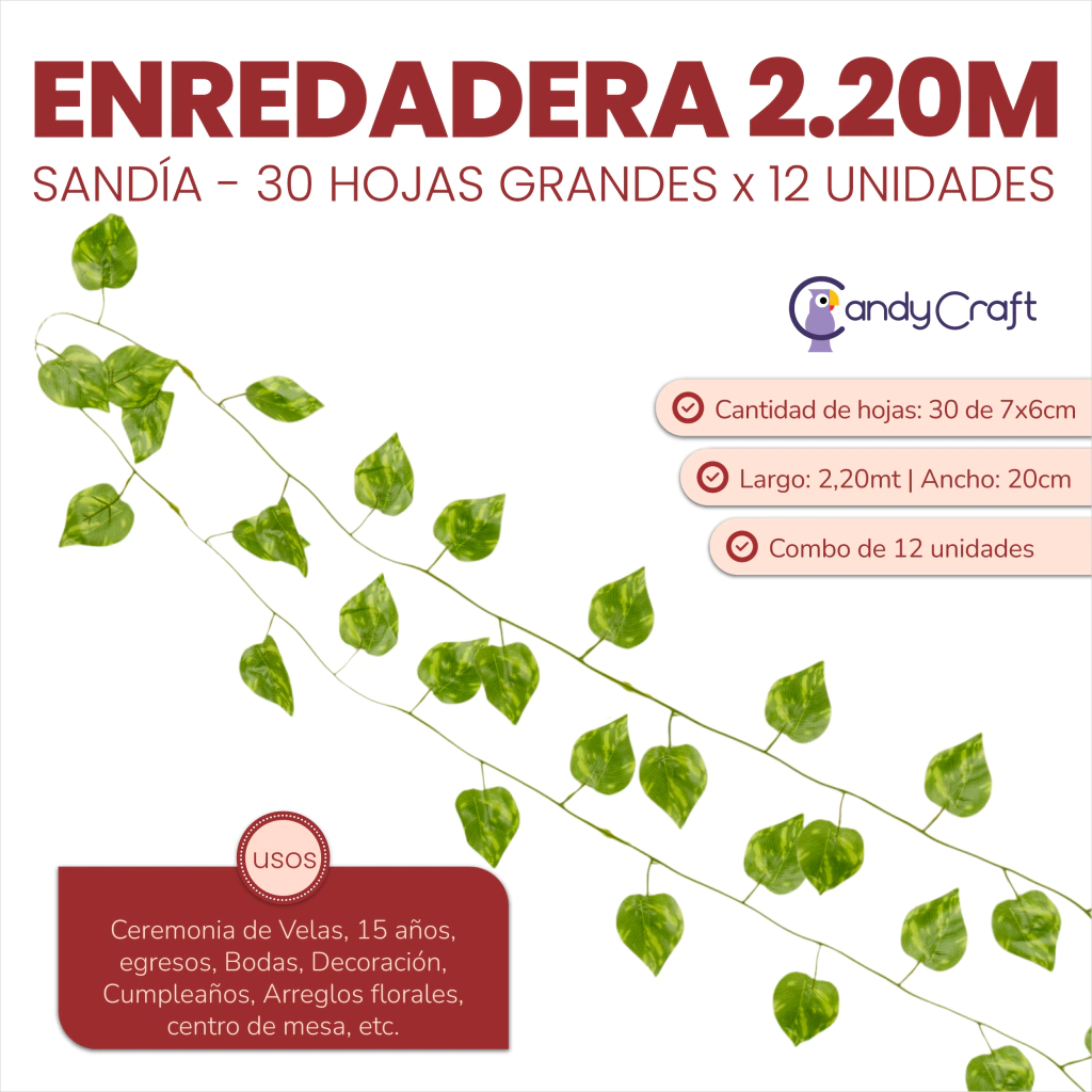 Largo: 2,20 metros. Ancho: 20cm. Cantidad de hojas: 30 hojas de 7x6cm aprox. dependiendo del modelo. Combo de 12 unidades. Usos: Decoración de Pared, Ambientación, Decoración de espacios estilo patio, Arcos de entrada a casamiento, techos de enredadera, decoración de hogar, etc.