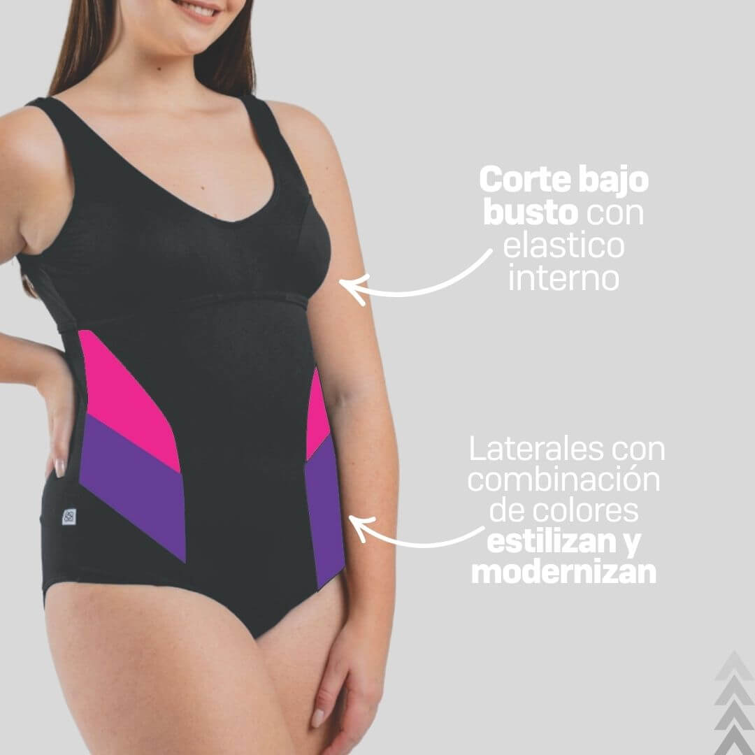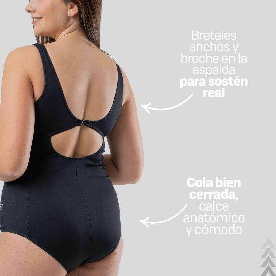 Con breteles anchos, broche en espalda y laterales en contraste, es ideal para moverte con confianza dentro y fuera del agua.