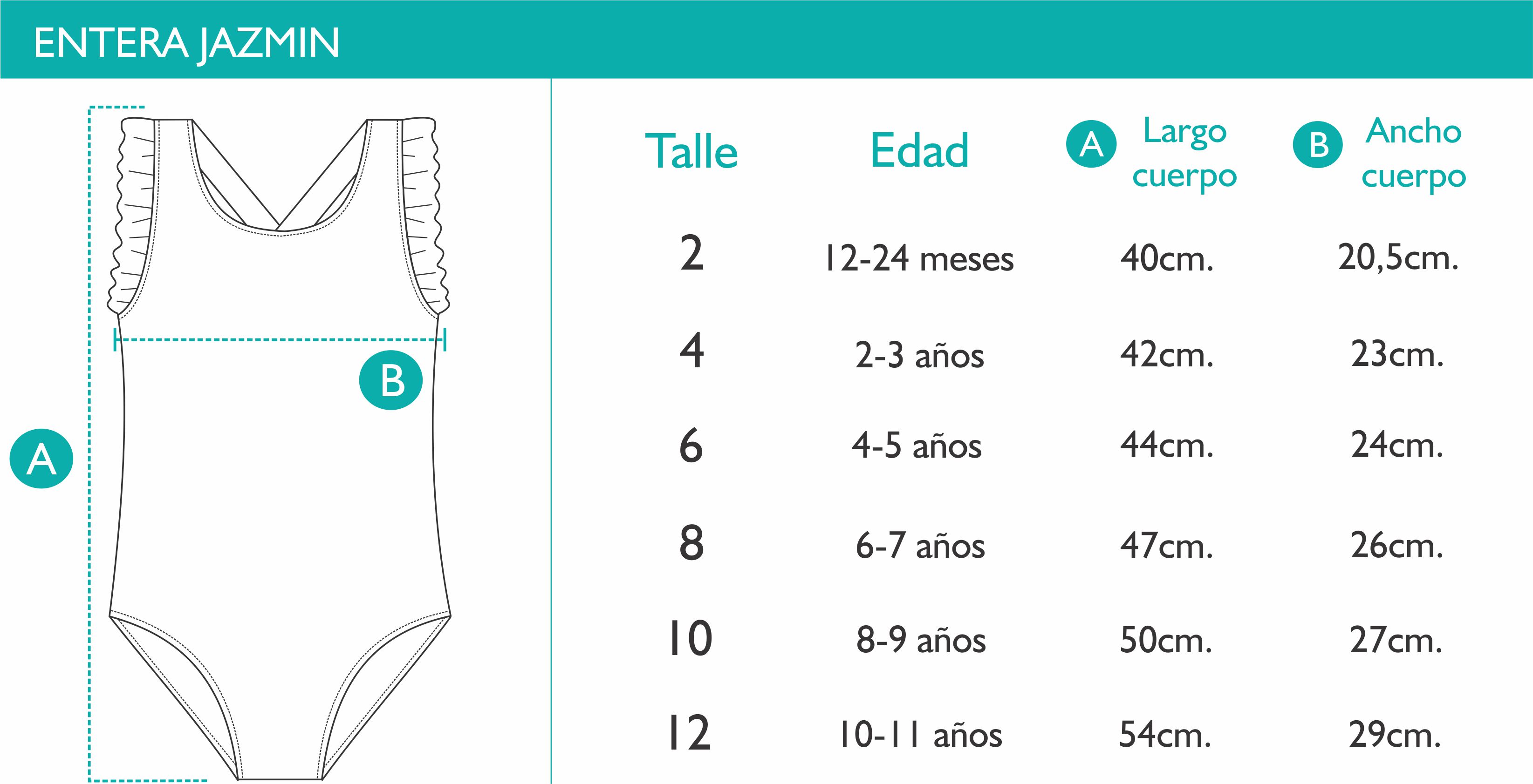 Lo ideal es medir una malla que tengan que le quede bien a la niña desde el hombro a la entrepierna y comparen la medida con la tabla que ven arriba. Cualquier duda pueden consultarnos, tambien tienen un video explicativo en Instagram y en la página de la tienda que dice medidas 😉