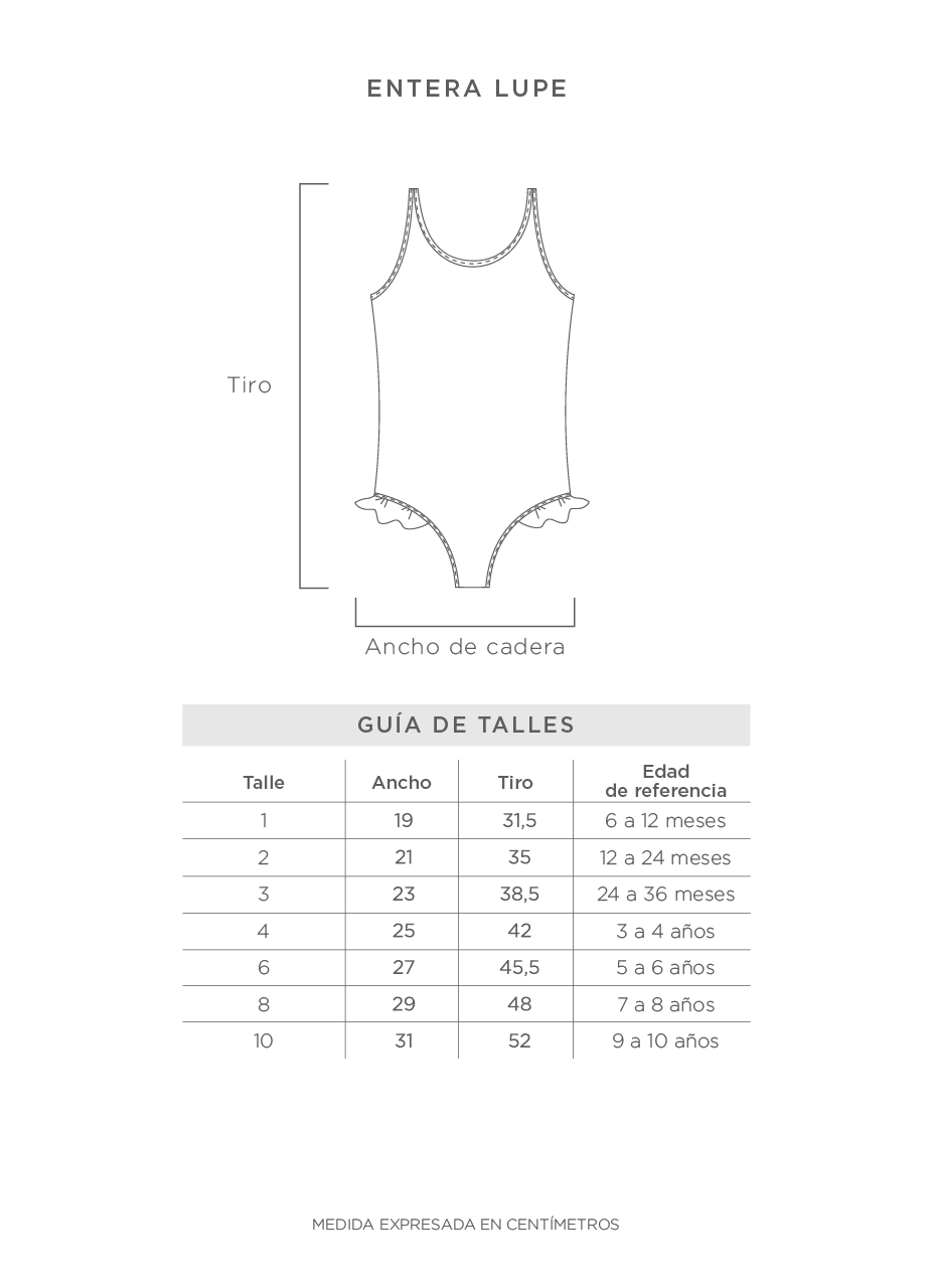 CONSEJO: Te recomendamos que midas una malla que ya tengas y la compares con la guia de talles de ANITA LUQUE. Las edades de referencia van a depender mucho de la contextura de cada nena, asi que lo mejor va a ser que te fijes en los centímetros. Cualquier duda que tengas escribinos que te ayudamos!