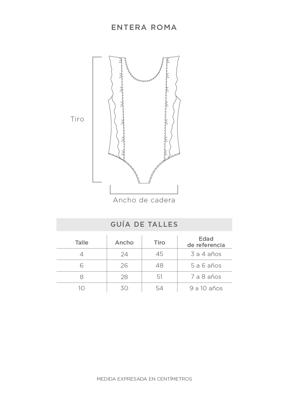 CONSEJO: Te recomendamos que midas una malla que ya tengas y la compares con la guia de talles de ANITA LUQUE. Las edades de referencia van a depender mucho de la contextura de cada nena, asi que lo mejor va a ser que te fijes en los centímetros. Cualquier duda que tengas escribinos que te ayudamos!