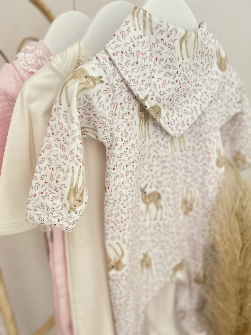 Enterito de puro algodón estampado,viene con babero o gorrito.Talle 0 a 3 meses