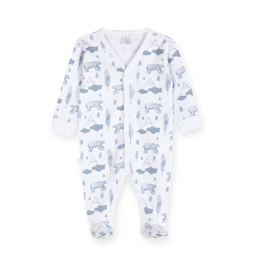 Enterito manga larga con broche y pieEstampado osos y montañasColores:BlancoCrudoTalles: 00 al 4Interlock peinado algodón 100%
