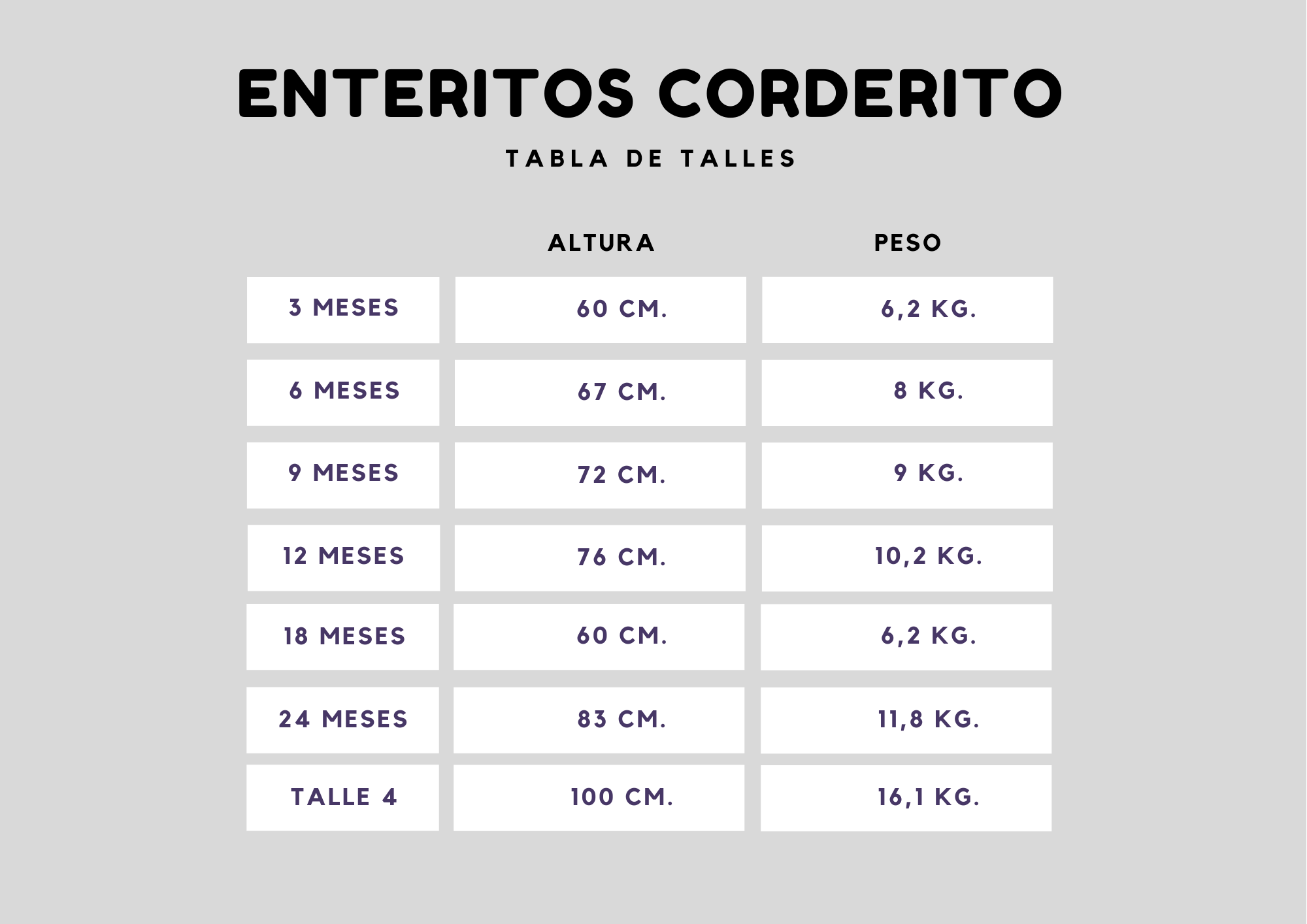 Te podés guiar por la siguiente tabla de talles para comprar tu enterito.