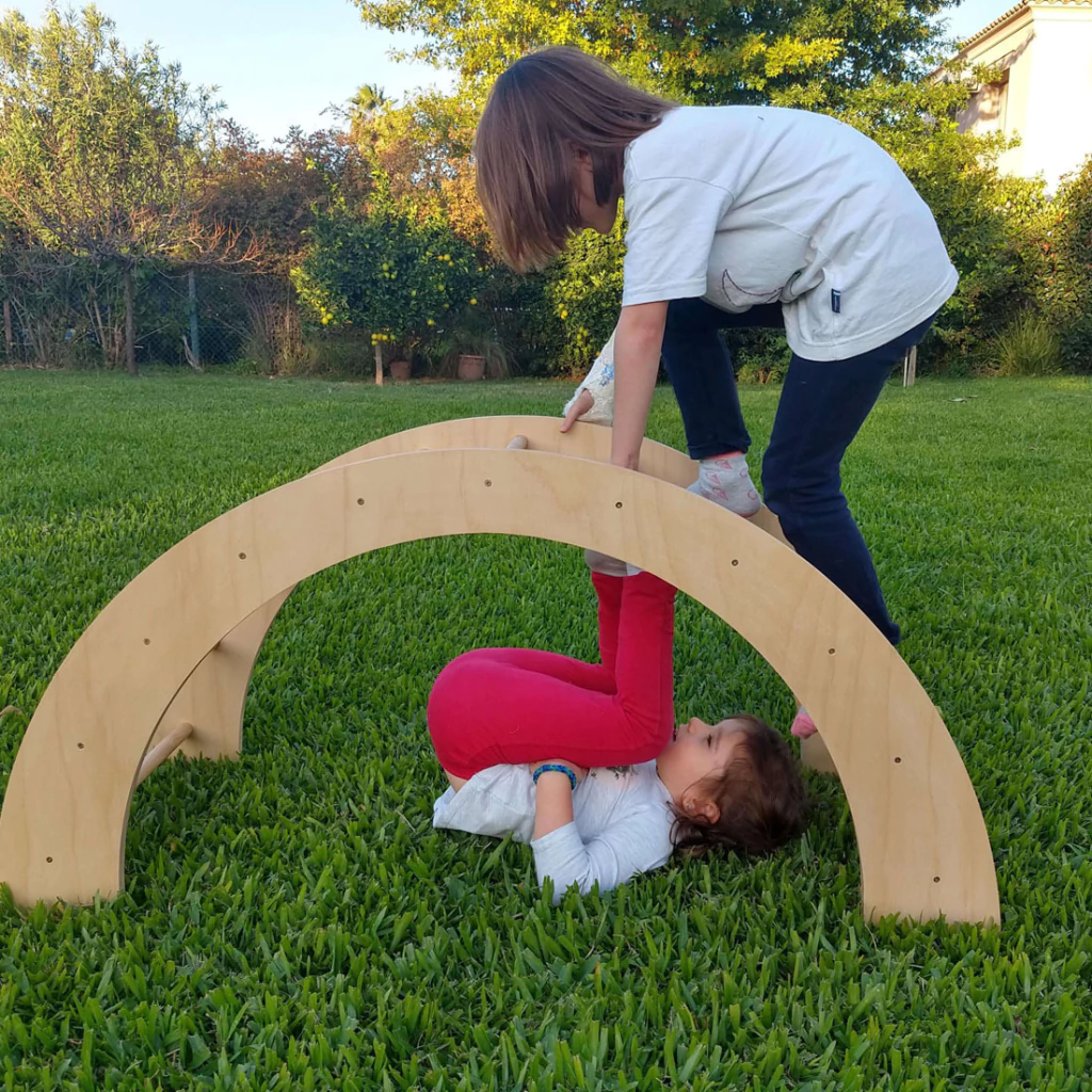 Con la escalera de arco los niños aprenden a desarrollar sus habilidades motoras y entrenan su sentido de equilibrio y coordinación. El ascenso exitoso en el arco de escalada aumenta la confanza en sí mismos y los niños aprenden en qué pueden confiar y dónde se encuentran sus límites.Puede combinarse con la rampa, el triángulo y cualquier otro material Pikler.Está fabricada en multilaminado de araucaria de la mejor calidad e hidrolaqueada para un mejor acabado.Mide 1,20 de largo x 50 de prof. x 60 de alto.