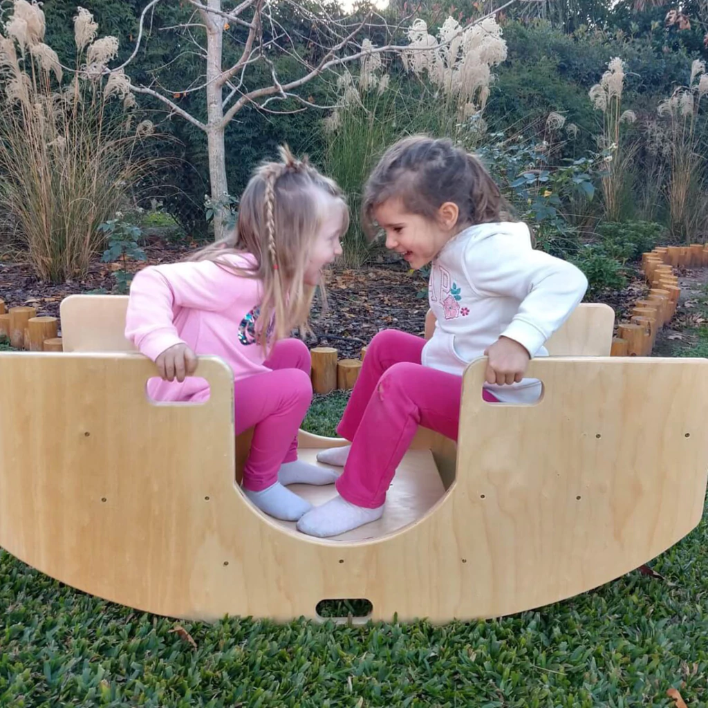 La escalera oscilante es una estructura sólida, ideada para facilitar el movimiento y la exploración corporal libres y seguros para los bebés y los niños pequeños. Es un material de psicomotricidad que acompaña con calidad diferentes etapas del juego infantil, y que pueden utilizar tanto los niños que gatean como los que ya caminan, porque supone un reto diferente para cada uno.Además, al voltearse, puede usarse como un balancín con capacidad de hasta 4 niños. De esta manera permite el trabajo de cooperación y en equipo.Mide 110 cm de largo x 45 cm de prof. x 50 cm de alto. Esta fabricada en multilaminado de araucaria de la mejor calidad y completamente hidrolaqueada.Linda no, divina!!