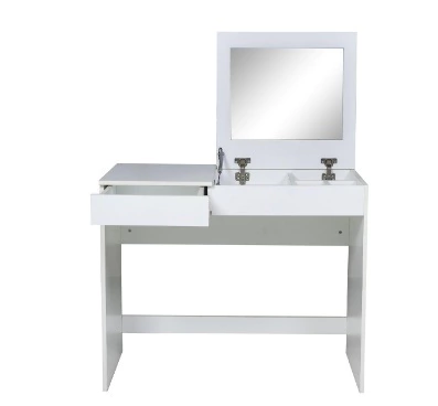 Escritorio Camarín 90 CM con EspejoEste elegante escritorio camarín combina funcionalidad y diseño moderno. Con una estructura robusta de 92 cm de ancho, 76 cm de alto y 52 cm de profundidad, ofrece un espacio adecuado para tus actividades diarias de belleza y trabajo.Características:•Espejo integrado: Un espejo amplio y claro, ideal para maquillarte o arreglarte, montado en la parte superior del escritorio.•Superficie de trabajo: Espacio suficiente para colocar cosméticos, herramientas de belleza y otros accesorios.•Cajones de almacenamiento: Incluye varios cajones que te permitirán mantener tus productos organizados y al alcance de la mano.•Material: Fabricado con materiales de alta calidad, como madera MDF o aglomerado laminado, que aseguran durabilidad y fácil mantenimiento.•Acabado: Disponible en varios acabados, desde blanco elegante hasta tonos de madera natural, que se adaptan a diferentes estilos de decoración.Dimensiones:•Ancho: 92,3 cm•Alto: 76 cm•Profundidad: 52 cmEste escritorio camarín es una excelente adición a cualquier dormitorio o vestidor, proporcionando un espacio dedicado para el cuidado personal y almacenamiento ordenado de tus productos.