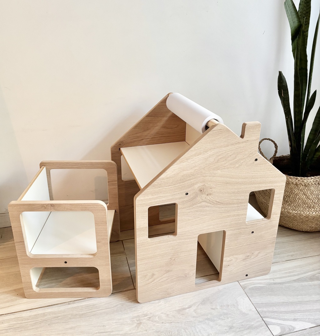 Casita montessori doble de un lado escritorio, del otro lado pizarra con porta rollo de papel de 22 mts aprox incluido, y estantes para libritos, muñecos, lapices, Etc