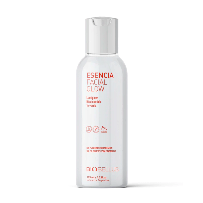 Esencia Facial Glow Biobellus x 125 ml¡Brinda luminosidad y unificación del tono de tu piel!Su consistencia líquida hidrata profundamente, y por la alta concentración de sus principios activos, favorece la absorción de los productos de tu rutina.NO TESTEADO EN ANIMALES (CRUELTY FREE)VEGANOLIBRE DE PARABENOSLIBRE DE SULFATOSLIBRE DE COLORANTESLIBRE DE PERFUMESDERMATOLOGICAMENTE TESTEADO¿Cuándo se aplica?Aplicar unas gotitas y esparcir con las manos luego de la limpieza y antes del sérum.¿Qué contiene?- Lumiglow:con el principio activo 100% del Maqui, ¡Un fruto típico de nuestra Patagonia argentina!- Niacinamida:ideal para restaurar la energía celular y combatir signos prematuros de envejecimiento- Té verde:aporta antioxidantes y previene el envejecimiento celular.Ingredientes:Water, Propylene Glycol, Glycerin, Aristotelia Chilensis Fruit Extract, Panthenol, Niacinamide, Gluconolactone(and)Sodium Benzoate (and) Calcium Gluconate, Camelia Sinensis Leaf Extract, Phenoxyethanol (and) Ethylexylglycerin, Calendula Officinalis Flower Extract, Hydroxyethylcellulose, Sodium Hydroxide, Disodium EDTA.