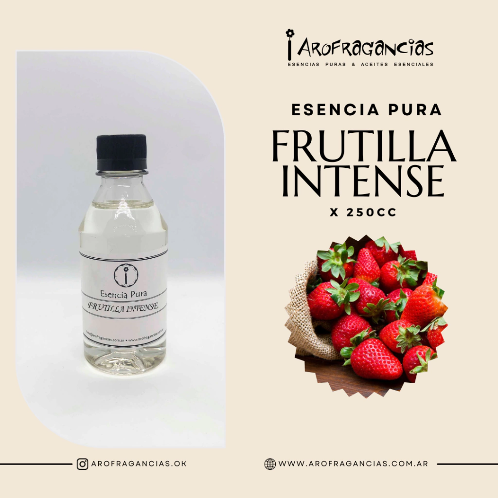 Detalles del producto:Nombre:Esencia Pura Frutilla Intense ArofraganciasDescripción olfativa:Frutal dulce cremosa intensaPresentación:Envase PET CRISTAL x 250 cc.Usos habituales:Velas de Soja, Difusores, Perfumantes Textiles y Ambientales, Body Splash, Perfumes para Autos, Productos Capilares, Hornillos ( todas las clases), Sahumerios ( todas las clases), Limpiadores Liquidos, Cremas, Geles, Productos de Higiene y Tocador, Pomadas, Unguentos, Polvos, etc.