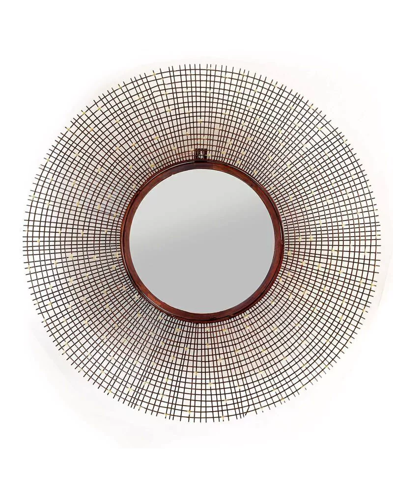 Realizado en metal con pátina cobre oscuro, este espejo originario de la India destaca por su estructura de varillas entrecruzadas, que evocan un telar abierto. Los sutiles acentos dorados entre la trama aportan brillo y profundidad. Ideal para agregar calidez, reflejos y una atmósfera contemplativa en livings, recibidores o espacios personales.