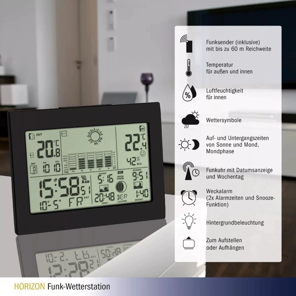 ESTACION METEOROLOGICA INALAMBRICA TFA - HORIZON• Temperatura interior y humedad interior con nivel de confort.• Temperatura exterior sin cable (433 MHz), hasta 60 m.• Pronostico del tiempo con símbolos y tendencia de la presión.• Presión atmosférica absoluta y relativa y grafico de las ultimas 12 horas.• Salida y puesta del sol y de la luna, fase de la luna.• Función MAX/MIN con reposición automático.• Iluminación de fondo azul.• Reloj, fecha, alarma, función snooze• Rangos: Temp Int 0ºC a +50ºC- Temp Ext –20ºC a +60ºC- Humedad Int 20 a 95%• Baterias: 5AAA (no incluidas)• Medidas. 158x26x133mm