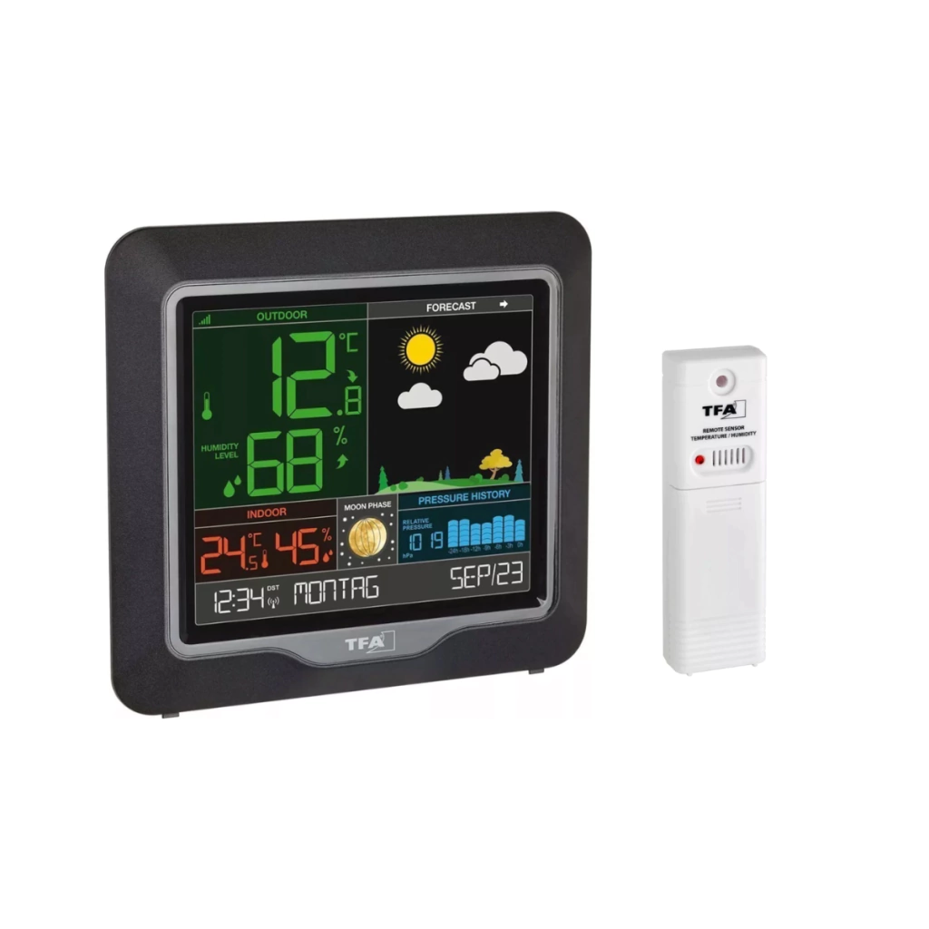 ESTACION METEOROLOGICA INALAMBRICA TFA - SEASON• Pantalla a color con 2 niveles de intensidad.• Símbolos de previsión meteorológica.• Gráfico histórico de la presión atmosférica.• Presión atmosférica en mbar.• Temperatura y humedad interior.• Temperatura y humedad exterior a través de sensor remoto.• Alcance hasta 100 metros en campo libre.• Alarma de temperatura y humedad.• Punto de rocío.• Rango de temperatura interior 0ºC - 37ºC / Exterior -40ºC - 60ºC• Rango de humedad interior / exterior 10 - 99% hR.• Indicación de ciclo lunar, reloj y calendario.• Soporte para sobremesa y para pared.• Alimentación: 3 pilas 1,5V AA (No incluidas)• Dimensiones: 175 x 165 x 32 mm.