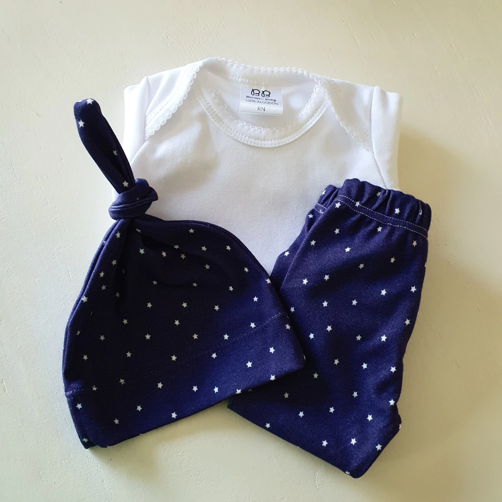 Hermoso ajuar 100% algodón pima.Body cuello americano con detalle de picot.Ranita Talle unico Recién nacidoGorrito nudo