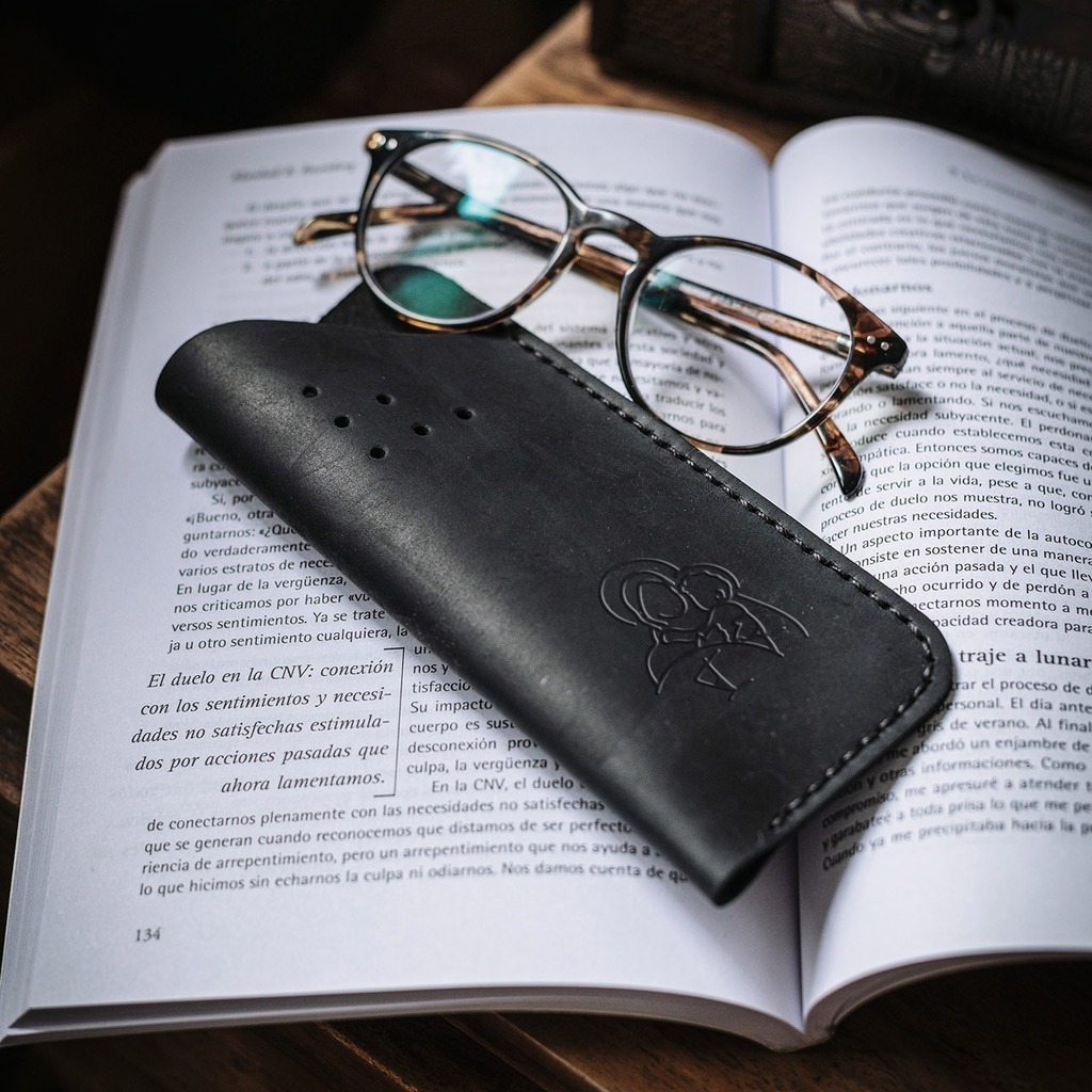 Un estuche sobrio y elegante para tus anteojos de lectura, confeccionado con el mejor cuero vacuno. La imagen de la Virgen viene grabado en la parte inferior.Cosido a mano con hilo de nylon encerado de primera calidadDimensiones: 7.5 cm de ancho x 17 cm de alto