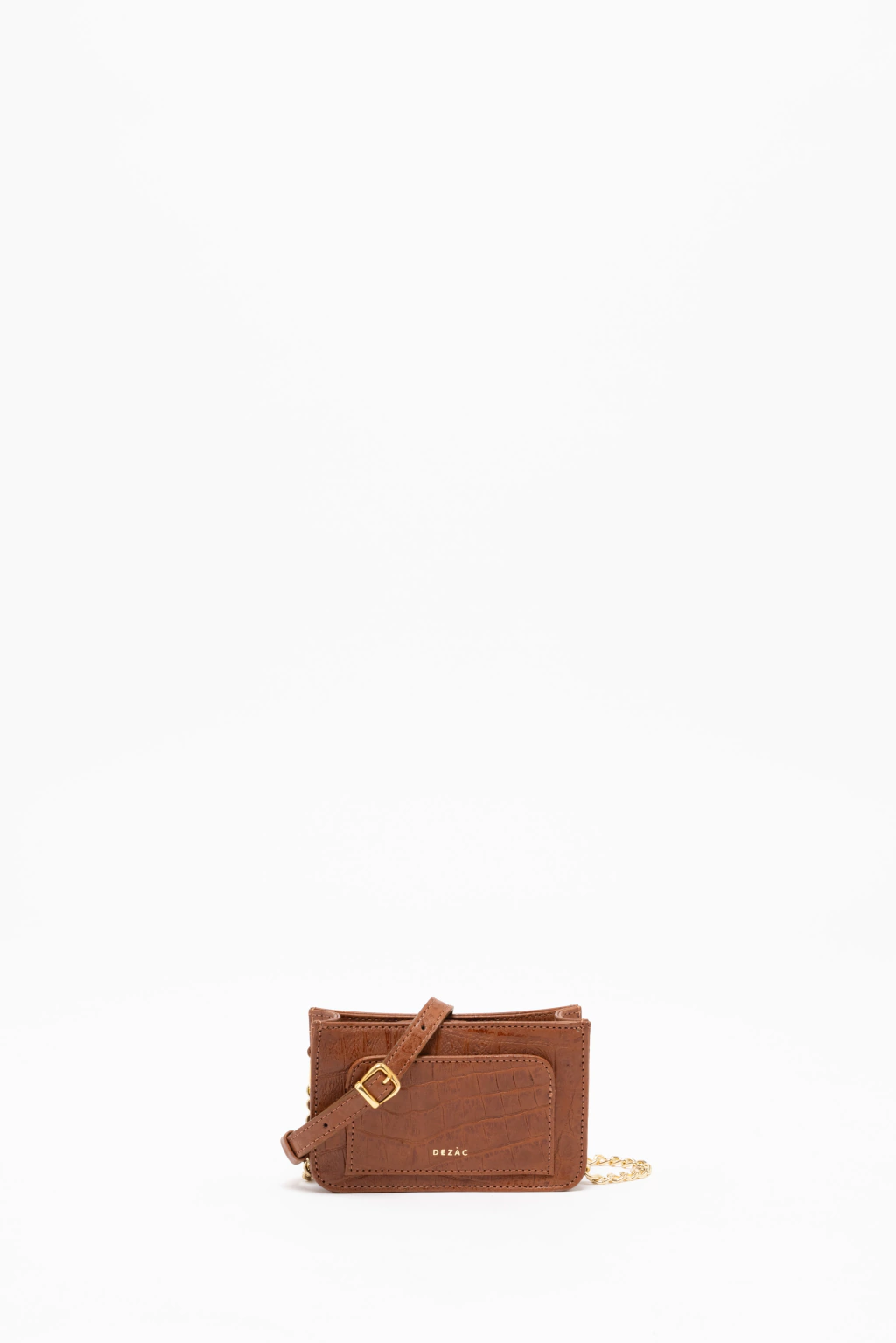 Confeccionado en cuero curtido vegetal relieve tipo croc. color caramelo. Este cuero desarrollará otro color con el tiempo, esa es la magia de este acabado. Para mayor información visitar: "Tipos de cuero" y "Cuidados de tu cartera".